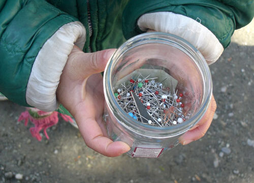 すでに数年分小ビンにためてあった色とりどりの折れた針たち。